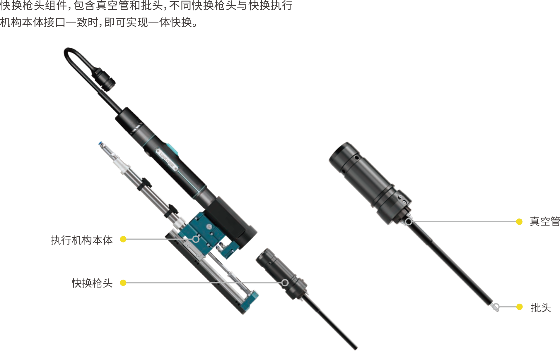 APP-Q系列适用于需要拧紧多种螺钉工况的单站,通过自动快换枪头,即可实现一套拧紧工具适应多种规格螺钉,从而缩短产线长度,节约工站数量。
