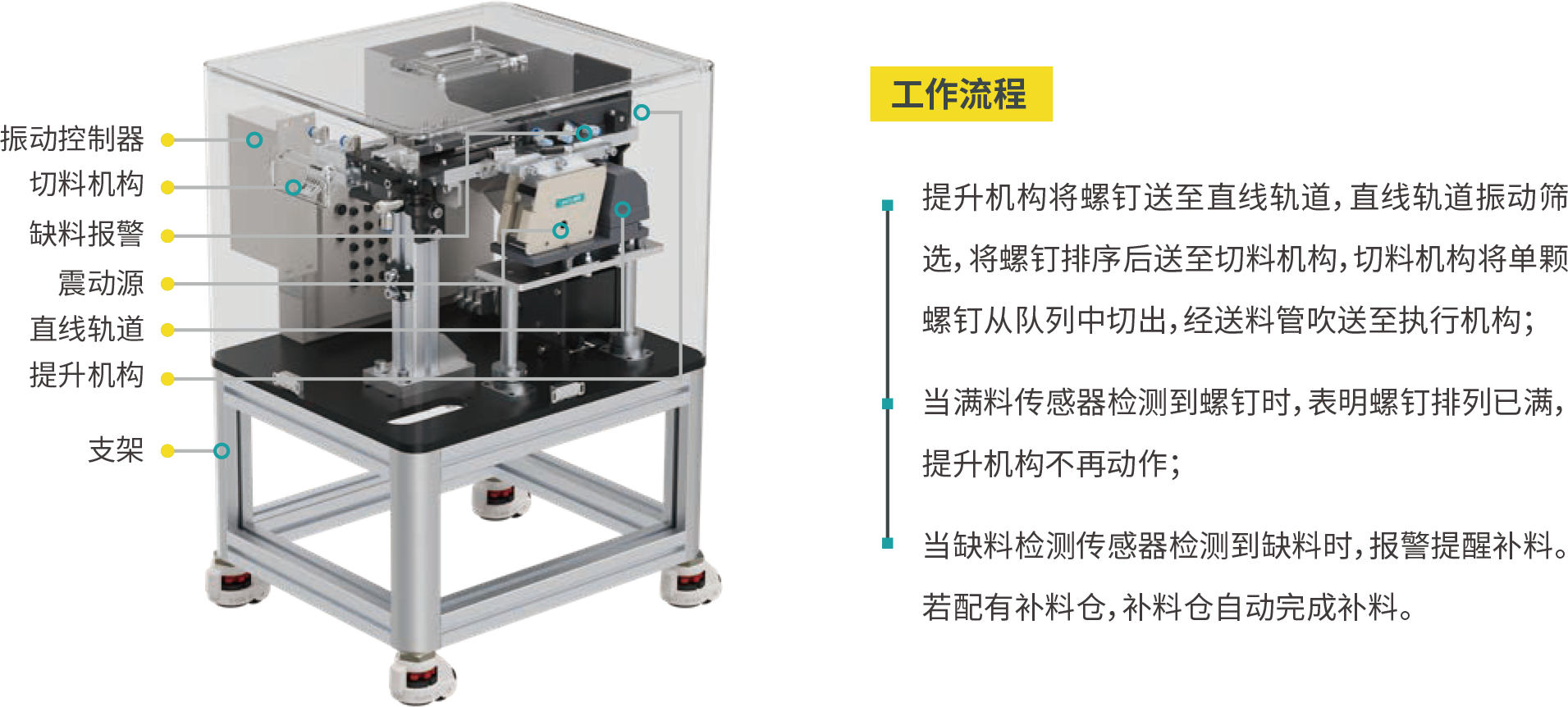 台阶提升式料斗相较于圆盘振动料斗,其振幅更低,振动过程更短,对螺钉表面涂层或耐落胶友好,广泛应用于如系能源三电等对螺钉洁净度要求高的装配场合。