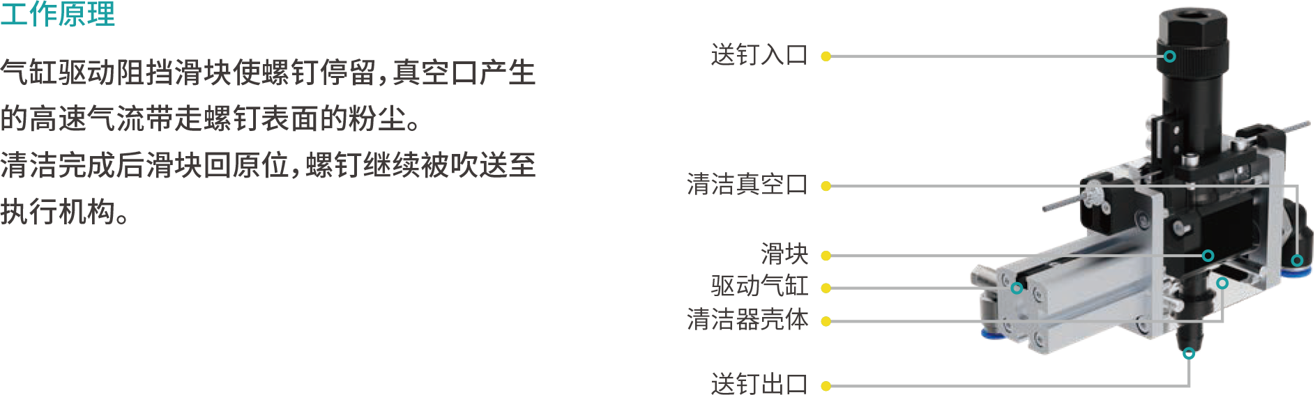 清洁器附件可以有效清除螺钉表面的粉尘特别是大颗粒金属粉尘,在PCBA、电机、电池(新能源三电系统),发动机内装等需要洁净装配的工艺中已广泛应用。