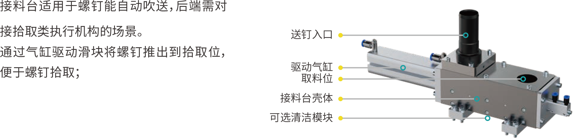 对于较大尺寸螺钉拾取应用,常用的排列机无法满足要求。可通过吹送方式从供料单元吹送至接料台,实现拾取拧紧。防跟转功能可完美适配外六角螺栓认帽需求。