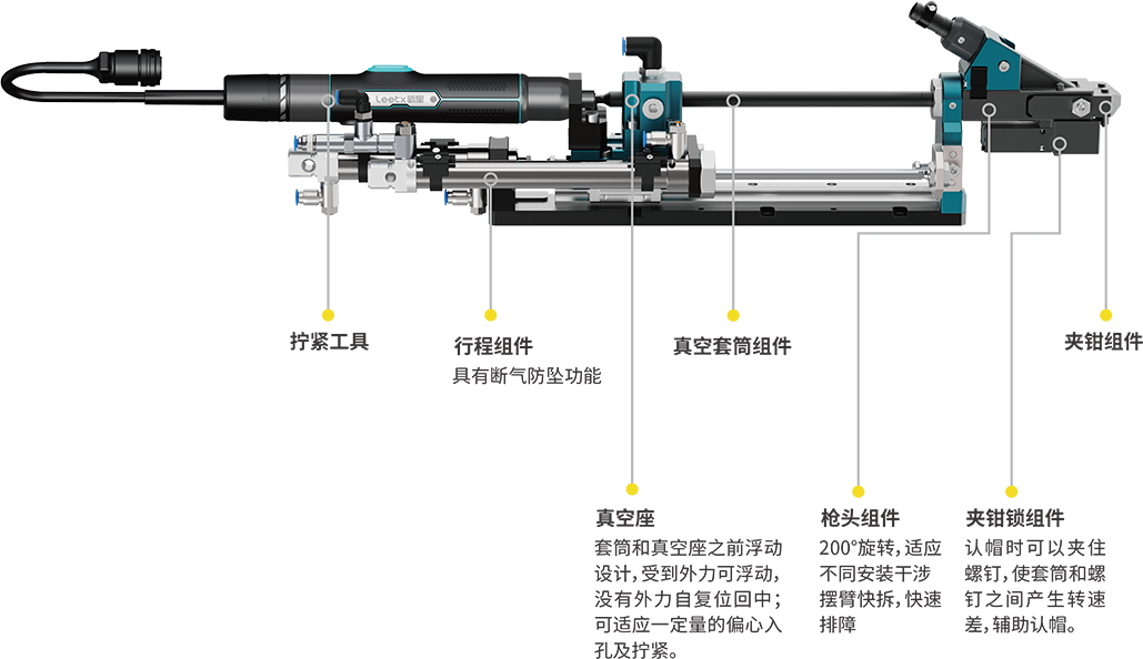 AOV系列执行机构将螺钉吹送到枪头组件,套筒吸取螺钉需做认帽动作后螺钉送到工件表面。其浮动设计可以在受外力干扰时主动复位回中,接受一定偏心量的拧紧。